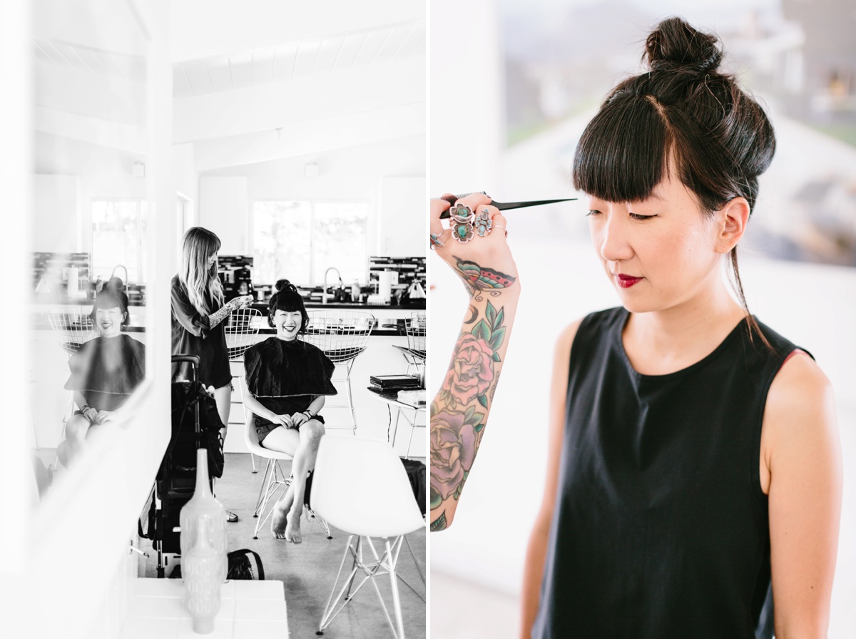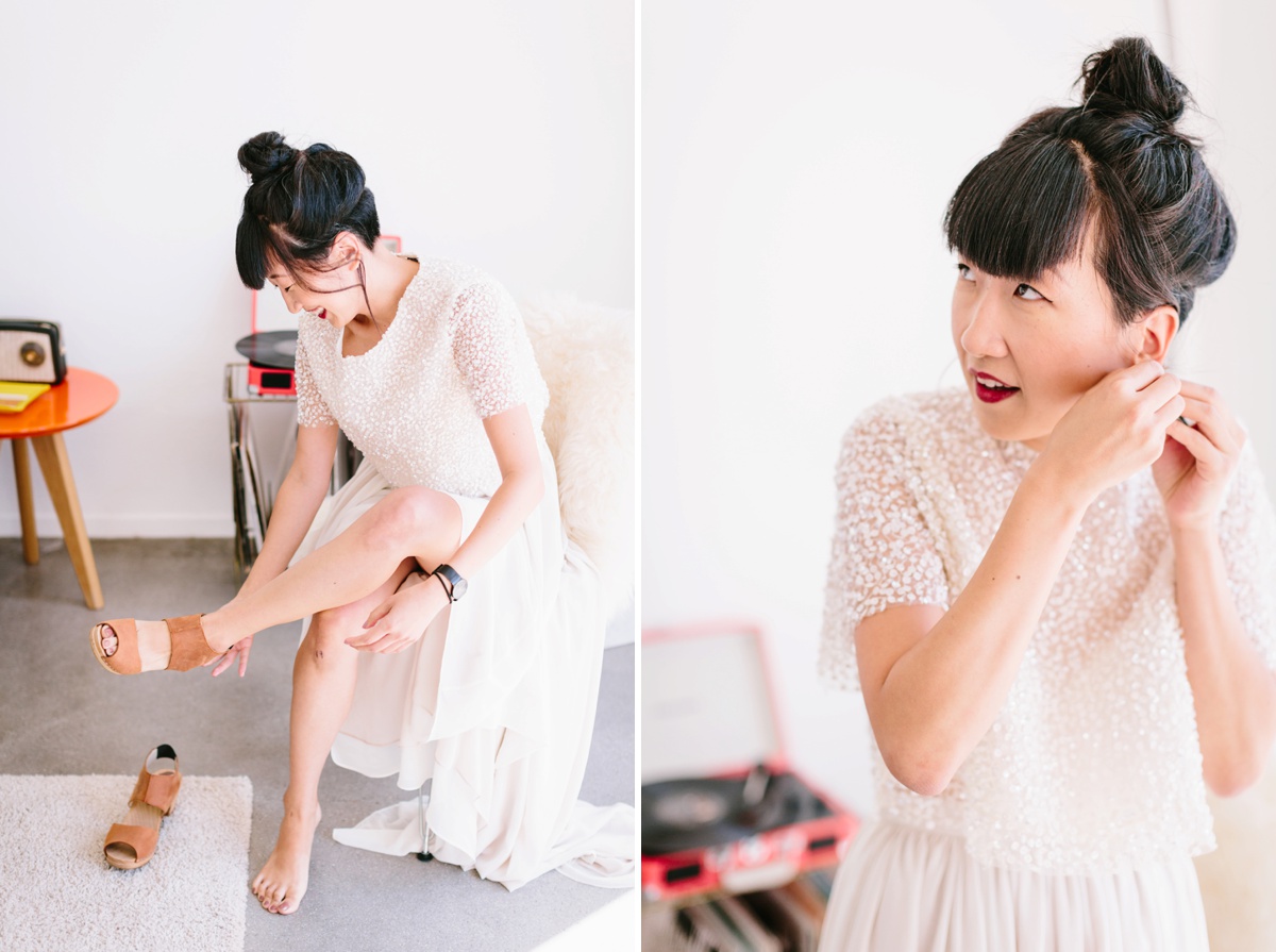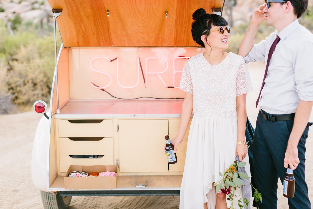 Lauren wore a gorgeous Sarah Seven top and a Free People skirt to create her dress look, while Wes wore a navy suit and burgundy tie. They wanted a minimalist look with a wabi-sabi feel so they teamed up with Flora Pop to create the experience. Along with providing officiant services, Flora Pop created the bouquet and brought in a pop-up trailer for the reception.