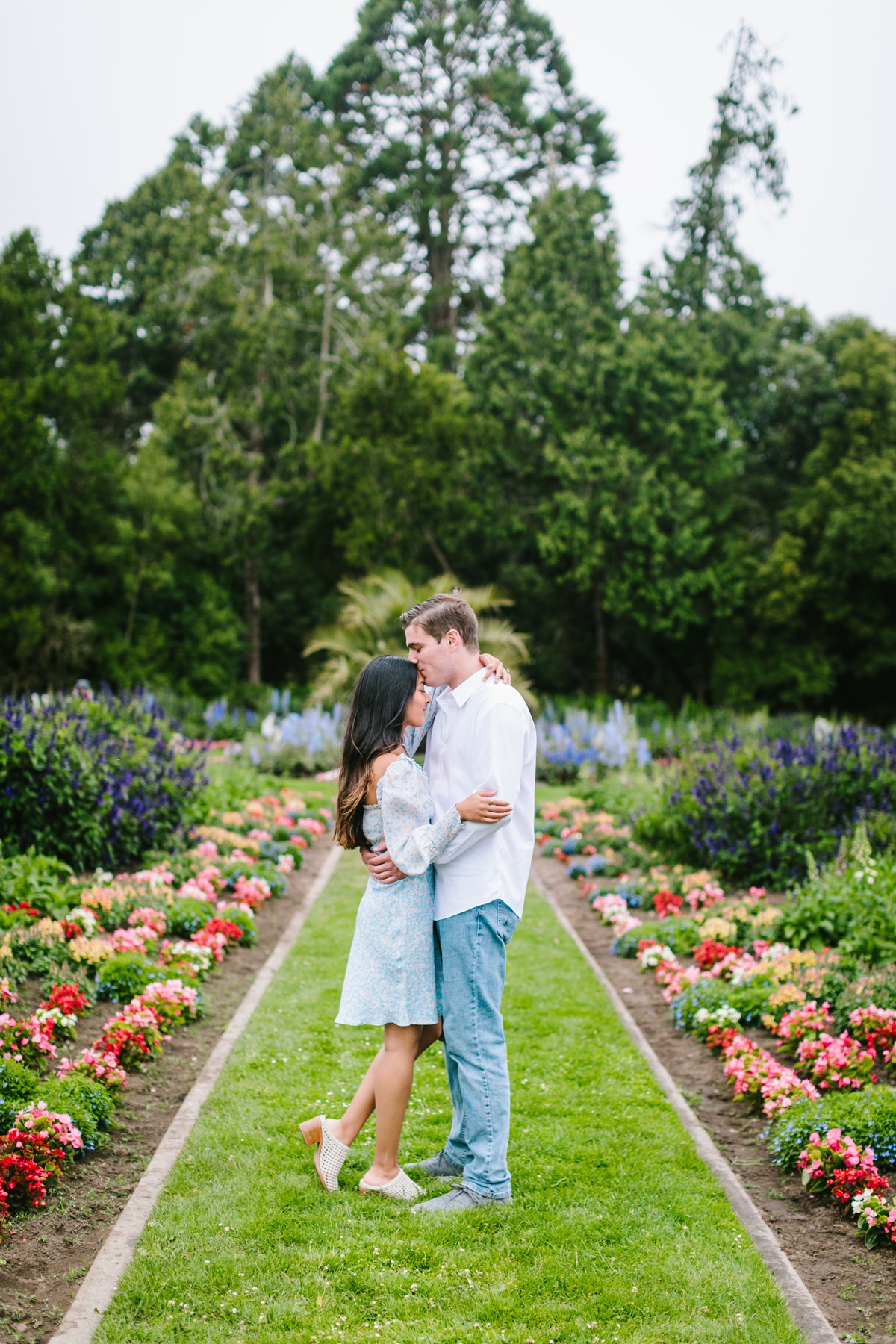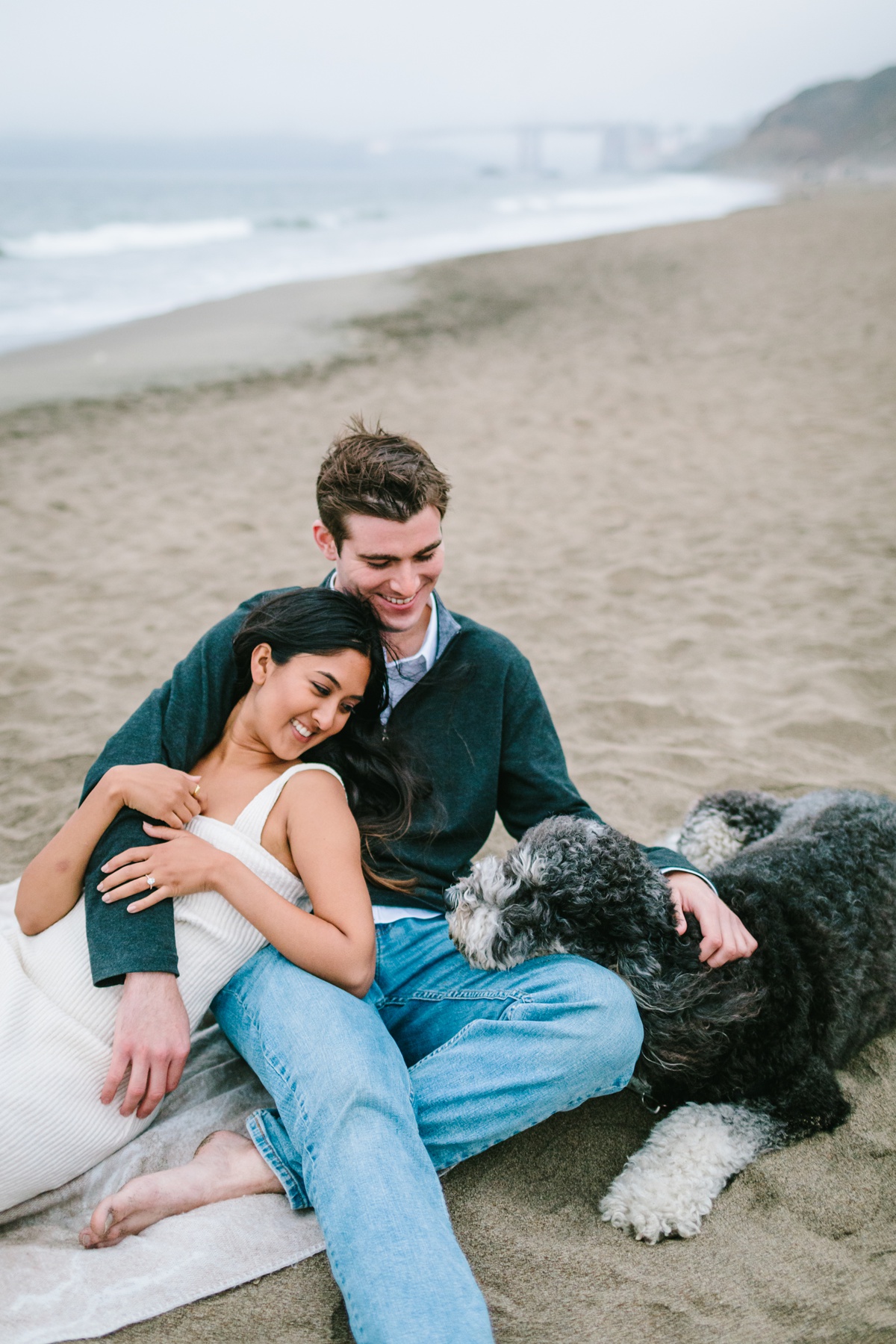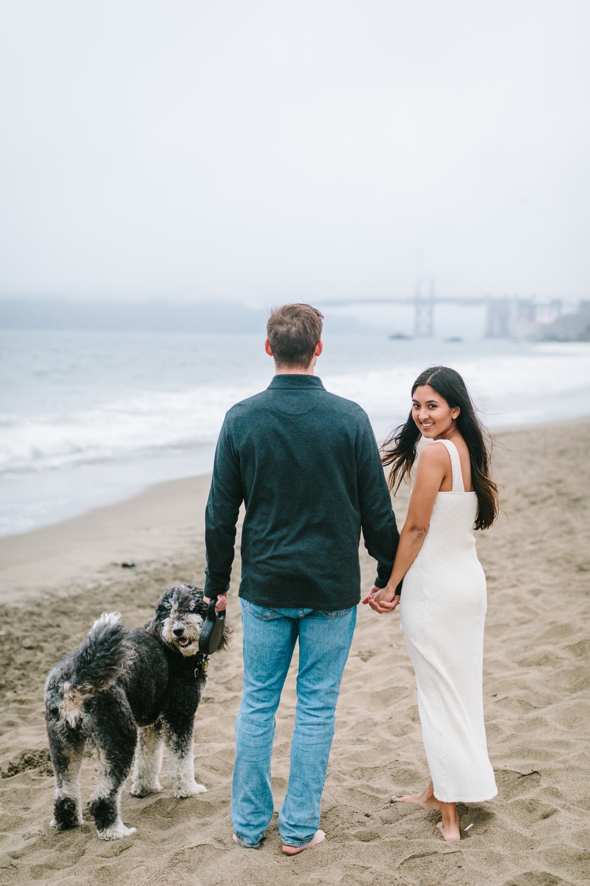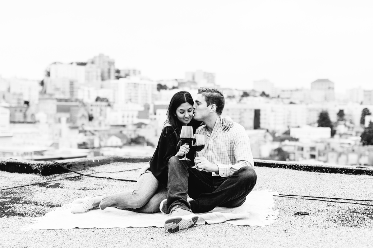 Roosha and RJ wanted to take their photos in SF, the city where they met and lived together before moving to Chicago! It ended up being a classic SF summer day: freezing and foggy! Mark Twain was not joking when he said the coldest winter he ever spent was a summer in San Francisco! But we made the absolute best of it. If you’ve lived in SF, you know drinking on your shady rooftop is a real thing so we started up there first with wine to get the party started. We then headed to the Conservatory of Flowers with their adorable pup Leah!! And ended their engagement sessions at a moody Baker Beach. The GG bridge peaked out for us creating a classic SF vibe. Here are some of my favorites. Congrats Roosha & RJ!!!
